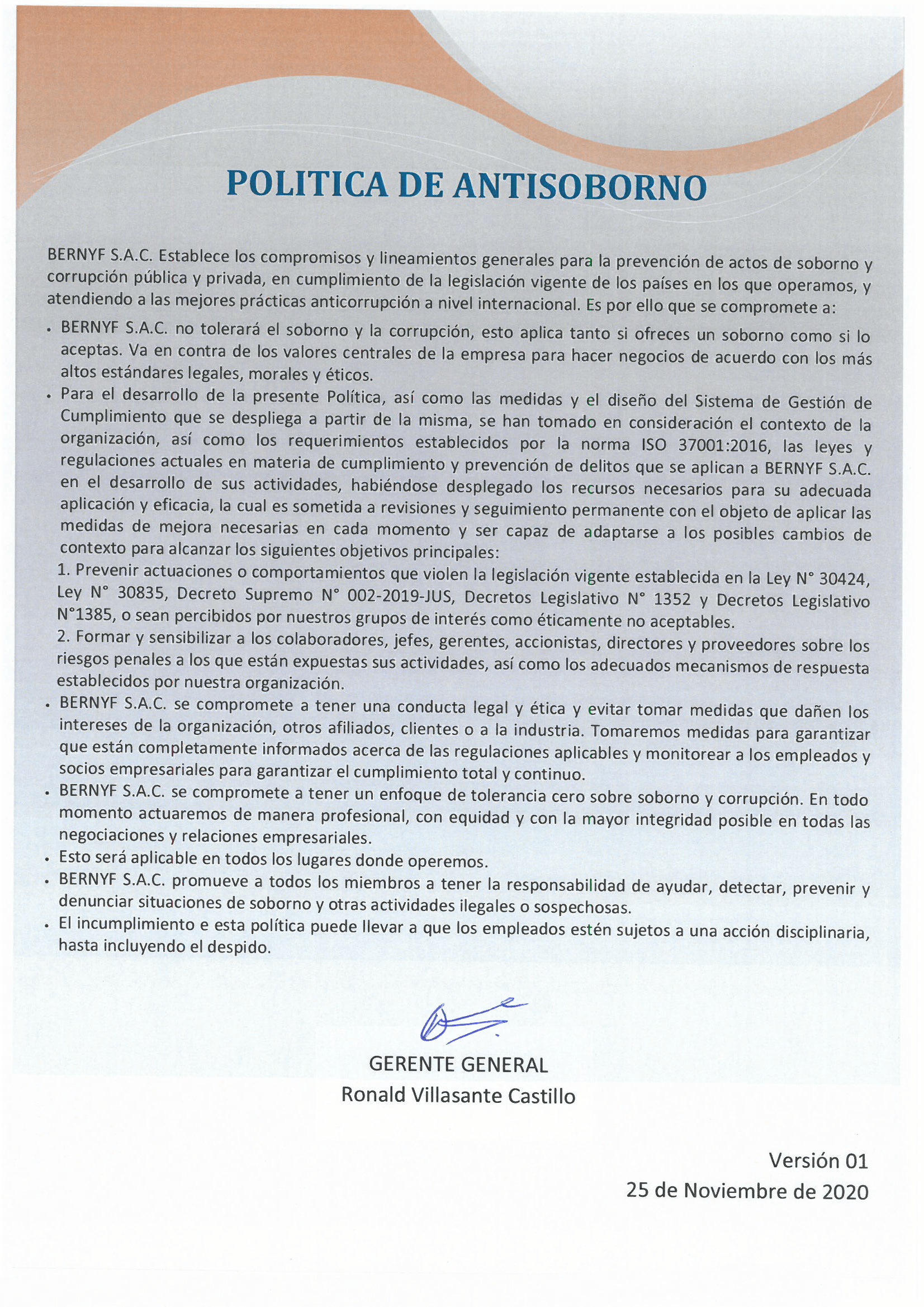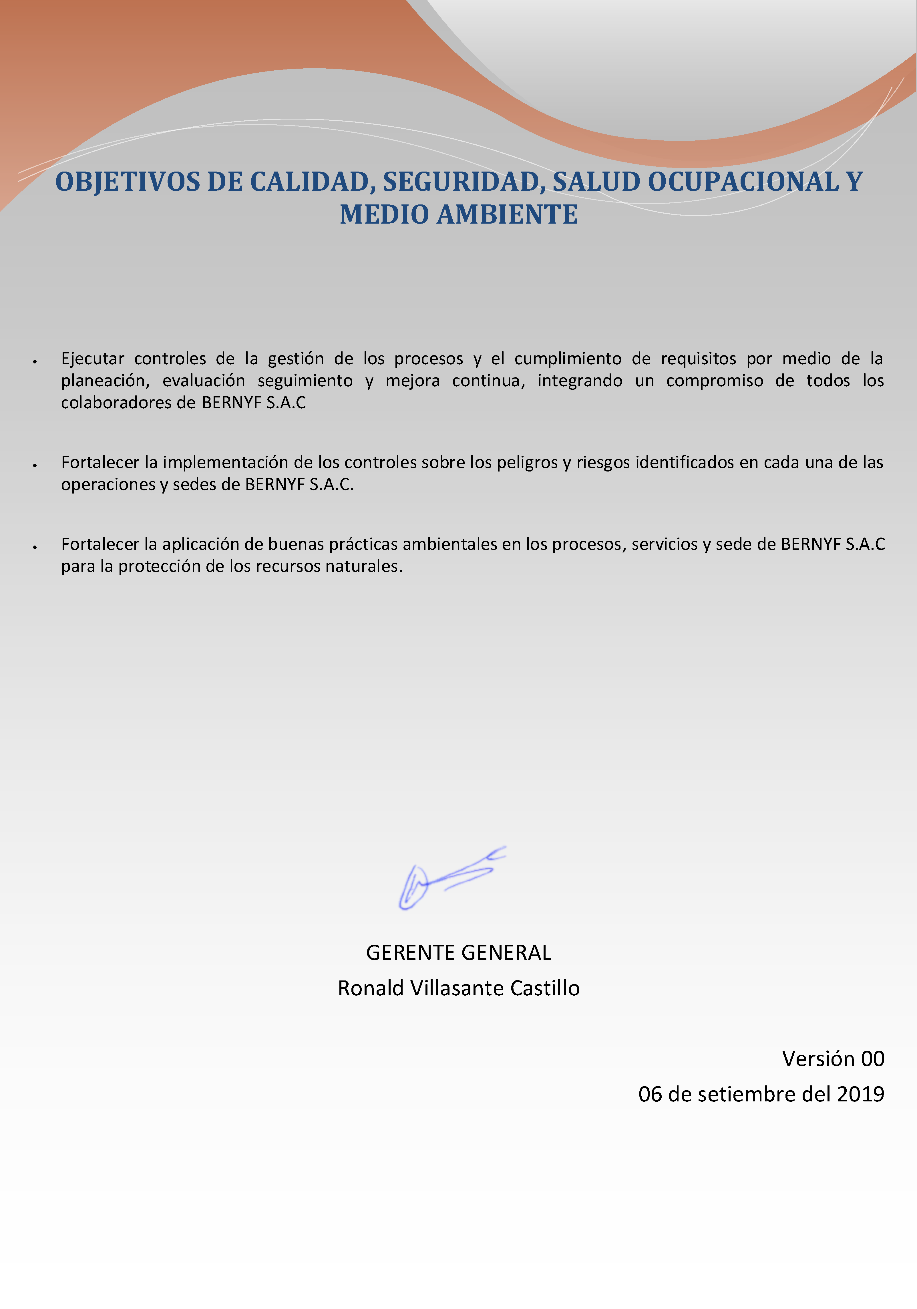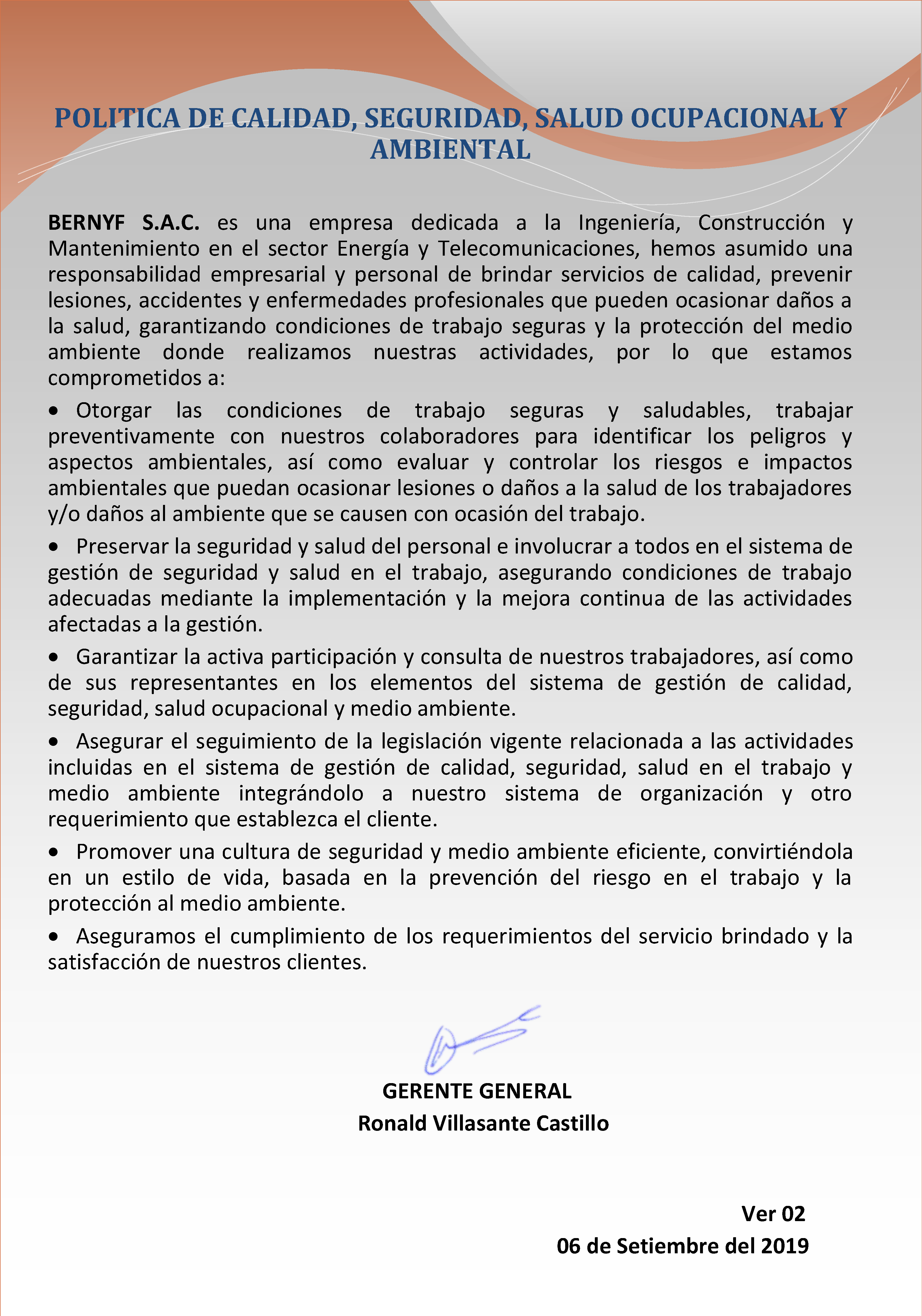 En BERNYF S.A.C. Trabajamos para mantener la integridad de los procesos, minimizar riesgos y promover la MEJORA CONTINUA e INTEGRACIÓN DE LOS SISTEMAS DE GESTIÓN DE LA ORGANIZACIÓN, proporcionando al cuidado de la salud, seguridad y medio ambiente, la misma importancia que a la rentabilidad, operatividad, calidad, ética y todas las actividades comerciales implicadas.